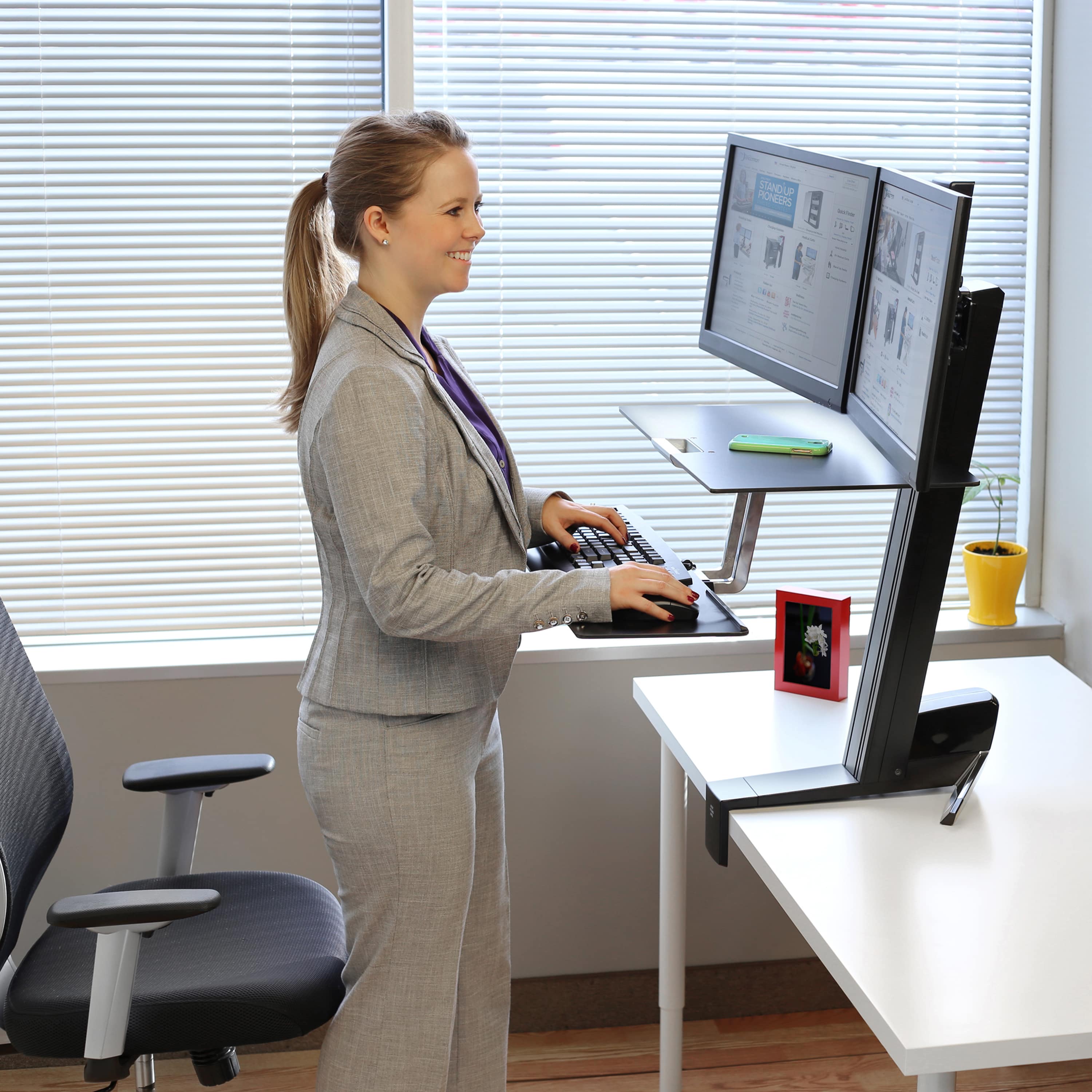 En la medida que permita a sus funcionarios ajustar sus pantallas o equipos portátiles a su propia altura y condiciones físicas, dándoles la posibilidad de cambiarlos de posición frecuentemente con un mínimo de esfuerzo.. mejorará considerablemente el ambiente de trabajo evitando dolores de espalda y molestias en el cuello resultado de malas posiciones, pues serán los equipos los que se ajusten a cada usuario final y no como ocurre en la mayoría de los casos donde los funcionarios se adaptan a los equipos.